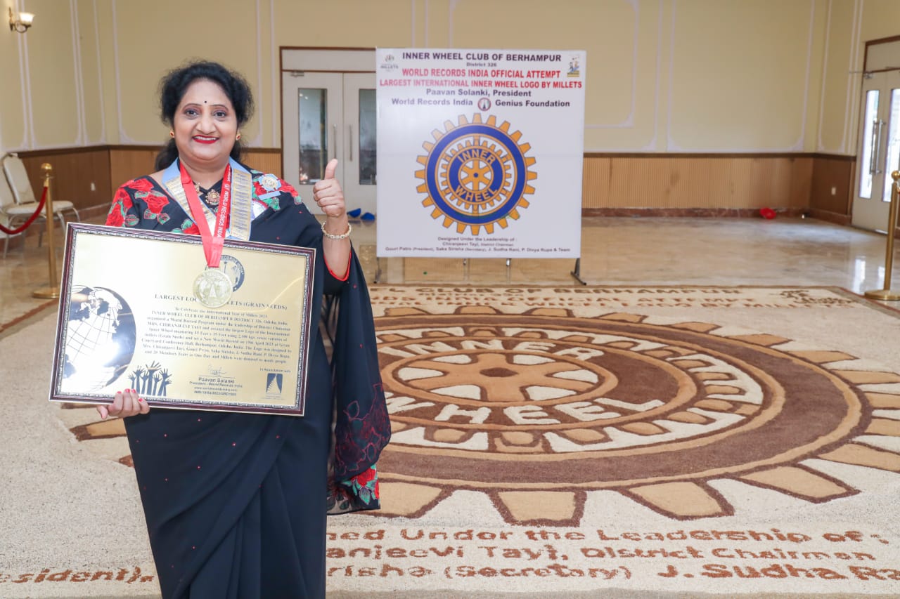 This year 2023 was declared as International year of Millets by United Nations. To Celebrate the International Year of Millets 2023, Inner Wheel Club of Berhampur District 326 Odisha, India organized a World Record Program under the leadership of District Chairman Mrs. Chiranjeevi Tayi and created the largest logo of the International Inner Wheel measuring 15 Feet x 15 Feet, it means 225 square feet, using 2,100 kgs. of seven variety of millets (grain seeds) and set a New World Record on 19th April 2023 at Berhampur, Odisha, India. The main motto of this project is Branding of Inner Wheel and awareness of benefits of Millets and distribution of Millets to Needy people. The brain behind this project is District Chairman Mrs. T. Chiranjeevi. The Logo was designed by Mrs. Chiranjeevi Tayi, Gouri Patro, Saka Sirisha, J. Sudha Rani, P. Divya Rupa and 20 members team in One Day and Millets were donated to needy people in 50 Villages .Mr. Pavaan Solanki president of World Records India was the special Invitee. MP Chandrasekhar Sahoo, Mayor Mrs. Sanghamitra Dalai, Chief Medical Health Officer, attended as guest of honours.